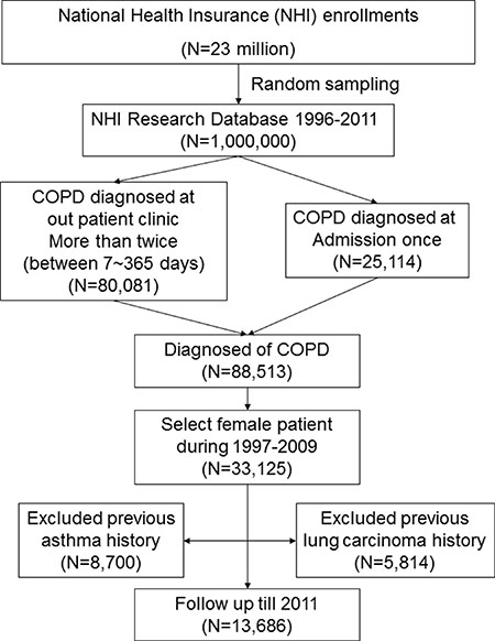 Figure 1: Flow chart for patient selection. Note : This is a retrospective, population-based study in which we extracted data of female patients newly diagnosed with COPD between 1997 and 2009 from the Taiwan’s National Health Insurance database (ICD-9-CM 491, 492, 496). Patients with COPD were defined by the presence of two or more diagnostic codes for COPD within 12 months. Patients were excluded if they were < 40 years, if lung cancer had been diagnosed prior to the diagnosis of COPD, or if the patient had cases of asthma (ICD-9 CM code 493.X) before the index date. The enrolled patients (n = 13,686) were followed-up until 2011, and the incidence of lung cancer was determined. Abbreviations: COPD: chronic obstructive pulmonary disease; ICD-9-CM, International Classification of Diseases, Ninth Revision–Clinical Modification.