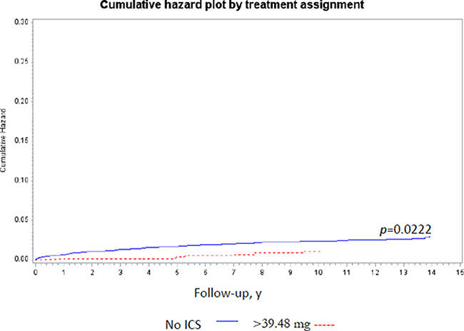 There were a number of important limitations associated with our study. First, we used ICD-9 diagnostic codes to enroll the patients; thus, we were unable to confirm COPD diagnosis by spirometry or differentiate severity by FEV1. Lung cancer may be related to COPD severity. However, many debates exist on the evaluation of COPD severity. The updated guidelines indicate that the evaluation of COPD severity needs a multidimensional approach. BODE (body mass index, airflow obstruction, dyspnea, and exercise capacity) score, comorbidities, and fibrinogen or CRP biomarkers are also considered important factors for COPD severity. Thus, multidimensional data collection is not easily done, even in a prospective study. In addition, ICS use is suggested in patients with severe and very severe COPD, according to GOLD guidelines. In theory, patients with severe and very severe COPD have a higher incidence of lung cancer than patients with mild and moderate COPD. However, our results show that patients with more severe COPD using ICS are less likely to have lung cancer, which further indicates that ICS reduced the incidence of lung cancer in COPD patients. Second, our study is a population-based cohort study. When or whether a patient starts to use ICS is decided by the physician. This eliminates interference by COPD stage and severity at initial enrollment. Third, the NHI database used to enroll the patients did not allow us to differentiate between squamous cell carcinoma and non-squamous cell carcinoma, despite the epidemiology and carcinogenic process being quite different between lung cancer subtypes. Fourth, we have concerns regarding medication adherence. Patients pay a part of all medical expenses under Taiwan’s current health-care system. It is not logical that these patients would see a doctor regularly and not take prescribed medicines, yet still be willing to pay for long-term medical costs. Thus, we believe that, although we calculated ICS dose based on NHI records that cannot show the dose that the patients actually received, the difference should be very limited. Another important limitation of the study is the lack of our NHI data for important risk factors, e.g., detailed patient history of tobacco use, symptoms, diet conditions and occupational exposures.