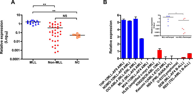 Figure 1: ZNF521 is aberrantly overexpressed in MLL-rearranged AML. (A) qRT-PCR for the expression of ZNF521 in 16 MLL-rearranged AML (MLL), 34 non-MLL-rearranged AML (Non-MLL) and 7 normal control (NC). The results are normalized to GAPDH and analyzed by 2−ΔCt method. NS, not significant, **P < 0.001, kruskal-Wallis test. (B) qRT-PCR analysis of ZNF521 expression in a representative panel of 12 human leukemic cell lines normalized to GAPDH and analyzed by 2−ΔCt method. Data are represented as mean ± SD of three independent experiments. y axis is linear. Inset, dot plots of mean ZNF521 mRNA levels in MLL-rearranged and non-MLL-rearranged cell lines from data presented in (B). *P < 0.05, Mann–Whitney U-test.