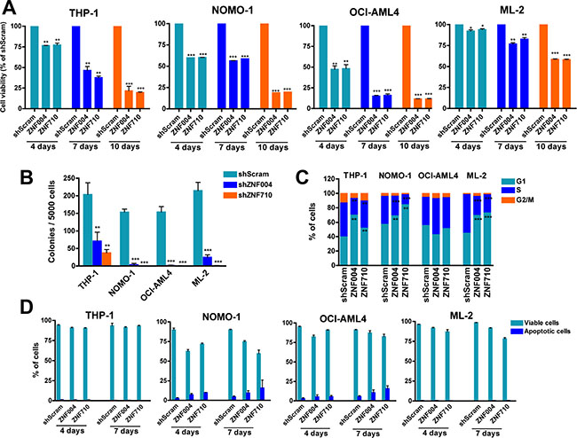 Figure 2: ZNF521 depletion impairs cell proliferation, induces cell cycle arrest but not apoptosis in MLL-rearranged cell lines. (A) MTT cell viability assay in the MLL leukemic cells THP-1, NOMO-1, OCI-AML4 and ML2 transduced with ZNF521 shRNAs (ZNF004 or ZNF710) or non-targeting scramble control (shScram). GFP+ cells were sorted 4 days after transduction and placed in appropriate medium. Graphs show percentage of GFP+ cells measured at day 4, day 7 and day 10, normalized to the percentage of shScram cells. Data are represented as mean ± SD of at least three independent experiments. *P < 0.05, **P < 0.001, ***P < 0.0001, t-test. (B) Colony formation of GFP+ cells transduced with ZNF521 shRNAs or shScram. Error bars represent mean ± S.D. of three independent experiments. **P < 0.001, ***P < 0.0001, t-test. (C) Cell cycle distribution at day 7 of ZNF521 knockdown cells and control shScram of gated GFP+ cells. Data are represented as mean ± SD of three independent experiments. **P < 0.001, ***P < 0.0001, t-test. (D) Percentage of apoptotic cells (Annexin V+/DAPI- and Annexin V+/DAPI+) measured after 4 and 7 days post-transduction of gated GFP+ cell population. Data are represented as mean ± SD of three independent experiments.