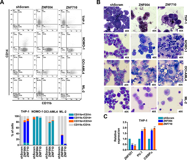Figure 3: ZNF521 depletion induces myelomonocytic differentiation in MLL-rearranged cell lines. (A) Representative flow cytometry dot plots of gated GFP+ cells analyzed for CD11b and CD14 expression after 7 days of transduction. The mean percentage of CD11b+/CD14−, CD11b−/CD14+, CD11b+/CD14+ and CD11b−/CD14− cells of three biological replicates are shown below. (B) Representative Wright-Giemsa staining of cytospin preparations at day 7 of THP-1, NOMO-1, OCI-AML4 and ML2 GFP+ cells transduced with ZNF521 shRNAs or shScram. Original magnification, × 40. (C) qRT-PCR on THP-1 GFP+ cells for the expression of ZNF521, PU.1 and C/EBPα at day 7 post transduction with ZNF521 shRNAs or shScram. The results are relative to shScram-transduced cells, normalized to GAPDH and analyzed by 2−ΔΔCt method. Data are represented as mean ± SD of three independent experiments. **P < 0.01, t-test.