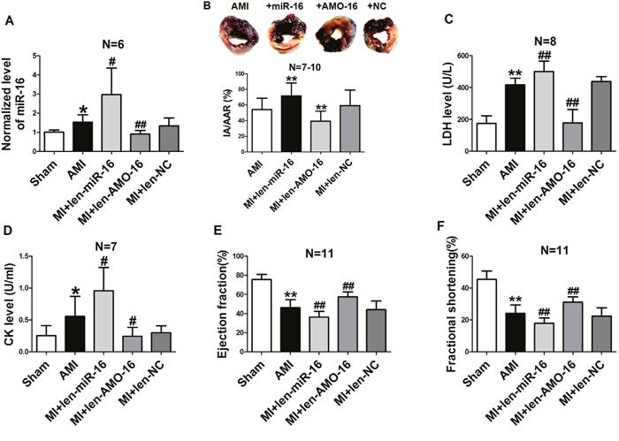 Rats in treatment group received len-pre-miR-16, len-AMO-16 or len-NC. Ligation of LAD was performed in rats 7 days after the above treatment. Cardiac function was evaluated in rats 6 h after AMI with transthoracic echocardiography using an ultrasound machine Vevo2100 high-resolution imaging system (Visual Sonics, Toronto, ON, Canada) equipped with a 10-MHz phased-array transducer, and heart function evaluation in control group was performed 6 h after LAD ligation. Rats were sedated with 3% sodium pentobarbital. Ejection factor, fractional shortening, and cardiac parameters were calculated from M-mode recording.