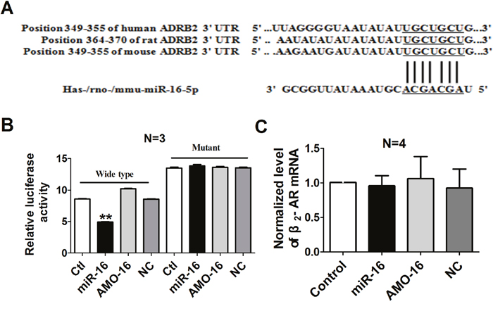 Figure 5: Verification of β2-AR as a target for miR-16. A. The 5’end seed region of miR-16 had complementary sites in the β2-AR mRNA 3’UTR. B. The interactions between miR-16 and its binding sites in the 3’UTR of β2-AR were measured by luciferase reporter gene assay in HEK293 cells. The intensity of luciferase was detected 36 h after transfection. **P < 0.01 vs. control. n=3. C. Effects of miR-16 on the mRNA level of β2-AR in cultured cardiac myocytes. n=4. Data are expressed as mean ± SD.