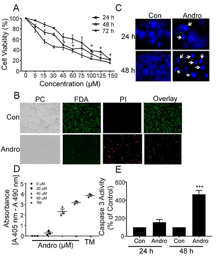 Figure 1: Andrographolide suppresses cell proliferation and cell survival in COLO 205 cells. (A) Cells were treated with Andro for 24, 48 and 72 h and cell viability was quantified by MTT assay. (B) Fluorescence microscopy images showing the viability of COLO 205 cells cultured in vitro with or without Andro (45 μM) (left to right: phase contrast (PC) image, FDA stain, PI stain, overlay of FDA and PI stain). (C) Cells were treated with Andro IC50 dose (45 μM) for either 24 h (upper panels) or 48 h (lower panels) and stained with DAPI. Apoptotic cells were identified by condensation and fragmentation (arrows) of nuclei using inverted fluorescence microscope. (D) Detection of nucleosomes in cytoplasmic fractions at increasing doses of Andro and TM. 104 cells were treated with or without Andro (20, 40, or 60 μM) or TM (1μg/ml) for 48 h at 37°C. Cell lysates (20 μl) were analyzed in the ELISA. (E) Caspase 3 activity was evaluated by Caspase-3 colorimetric activity assay kit as described. Experiments were performed two times (D and E) or three times (A, B and C). (*P < 0.05, ***P < 0.001).
