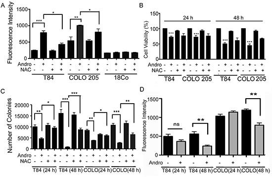 Figure 2: Andrographolide induces ROS generation in colon cancer cells. (A) The effects of Andro treatment on ROS generation. T84, COLO 205, and normal fibroblast cells (18Co) were treated with Andro IC50 (45 μM) for 24 h and cellular ROS levels were determined by measurement of fluorescent DCF. ROS inhibition was performed by pre-treatment of cells with 20 mM NAC for 1 h prior to Andro treatment. (B) The effects of ROS on cell viability in Andro-treated colon cancer cells were assessed by MTT assay at 24 h and 48 h in the presence of absence of NAC. Absorbance was read at 570 nm with averages from triplicate wells. (C) For quantification of clonogenicity Andro treated T84 and COLO 205 cells were examined by colony formation assay for 24 h and 48 h and visualized by staining with crystal violet. (D) T84 and COLO 205 cells were treated with or without Andro for 24 h and 48 h and then incubated with TMRE. Experiments were performed two times (A and D) or three times (B and C). (*P < 0.05, **P < 0.01, ***P < 0.001).