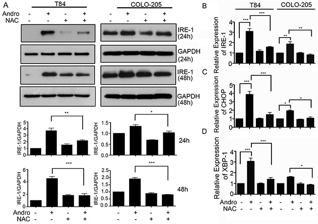 Figure 4: Andrographolide mediated ER stress and apoptosis signaling are dependent on increased ROS. (A) T84 and COLO 205 cells were pre-treated with or without NAC followed by Andro IC50 (45 μM) for 24 h or 48 h. Cells were lysed and protein expression for IRE-1 and GAPDH were evaluated by immunoblot. Densitometry analysis was performed and normalized with GAPDH. Cells were also evaluated for mRNA expression by qRT-PCR for (B) IRE-1 and pro-apoptosis downstream signaling proteins, (C) CHOP, and (D) XBP-1. Results shown are from three independent experiments (*P < 0.05, **P < 0.01, ***P < 0.001).