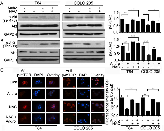 Figure 6: Andrographolide induced oxidative stress inhibits the Akt/mTOR cell survival signaling pathway. (A–B) Cell lysates from T84 and COLO 205 cells pretreated with or without NAC and then treated with Andro IC50 (45 μM) for 48 h were analyzed by immunoblot for expression of phospho-Akt (ser473 and Thr 308), total Akt and GAPDH and quantified by densitometry. (C) T84 and COLO 205 cells were grown on coverslips and pretreated with or without NAC, followed by Andro IC50 for 48 h and then phospho-mTOR expression was evaluated by immunofluorescent staining. Nuclei were stained using DAPI and cells were examined by fluorescence microscopy. Fluorescence intensity was determined and compared with untreated T84 and COLO 205 cells.