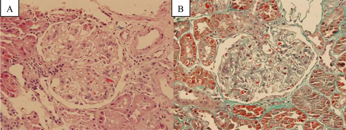 Figure 1: Kidney biopsy with light microscopy. A. hematoxylin-eosin stain (×400). B. Masson stain (×400).