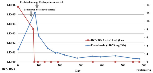 The optimal therapy for HCV-associated glomerulonephritis is still not very clear [3, 15, 16]. The evidence on treatment of HCV-related kidney disease comes predominantly from IFN-based therapies [5]. By literature review, we found two case reports of patients with HCV-associated glomerulonephritis, presented with deterioration of kidney function and proteinuria.[17, 18] Treatment with INF-2a (one plus ribavirin) resulted in sustained virological response with a clinical remission of proteinuria as well as stabilization of renal function. Thus, we suggest that anti-virus therapy could ameliorate proteinuria in patients with HCV related glomerulonephritis.