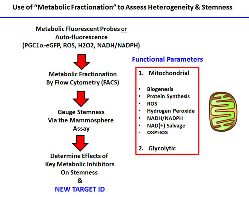 Recently, based on unbiased label-free proteomics analysis, we proposed that mitochondrial biogenesis may be a key driver of the CSC phenotype [7]. A prediction of this hypothesis is that high mitochondrial mass would be a metabolic biomarker for CSCs. To test this hypothesis experimentally, we used a vital dye, called MitoTracker, to stain mitochondria in living cancer cells. This allowed us to purify the Mito-high and the Mito-low cell populations by flow cytometry. Interestingly, the Mito-high cell population showed a clear enrichment of cells with the characteristics of CSCs [8-13]. Thus, the use of “metabolic fractionation”, using mitochondrial-based probes and flow cytometry, is a new successful strategy that also provides a functional assay for dissecting how metabolic heterogeneity contributes to the CSC phenotype.