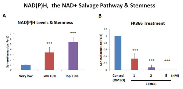 As further functional validation, we next examined the sensitivity of MCF7 mammosphere formation to NAD+ depletion, by employing the well-characterized NAMPT inhibitor, namely FK866 [14]. Figure 5B shows that mammosphere formation was dramatically inhibited by FK866, with an IC-50 of less than 1 nM. Thus, an intact NAD+ salvage pathway is strictly required for mammosphere formation, supporting our results using NAD(P)H auto-fluorescence, which enriched CSC activity by more than 5-fold.