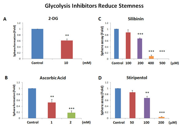 Interestingly, our results directly show that the classical glycolysis inhibitor, namely 2-deoxy-glucose (2-DG), inhibits mammosphere formation, with an IC-50 near 10 mM (Figure 7A). Similarly, we show that two other natural products that function as effective glycolysis inhibitors, also inhibited mammosphere formation. More specifically, vitamin C (ascorbic acid), which induces oxidative stress and inhibits the activity of GAPDH (a key glycolytic enzyme) [17], also inhibited mammosphere formation, with an IC-50 of 1 mM (Figure 7B). Therefore, vitamin C was ~10 times more potent than 2-DG at targeting CSC propagation. Interestingly, silibinin (the major active constituent of silymarin, an extract of milk thistle seeds) [18], which specifically functions as an inhibitor of glucose uptake, blocked mammosphere formation, with an IC-50 between 200 and 400 µM (Figure 7C). Finally, the FDA-approved drug stiripentol, which behaves as an LDHA inhibitor [19], blocked mammosphere formation with an IC-50 between 100 and 200 µM (Figure 7D). Thus, stiripentol was the most potent glycolysis inhibitor that we identified for targeting CSCs and it was 50 to 100 times more potent than 2-DG.