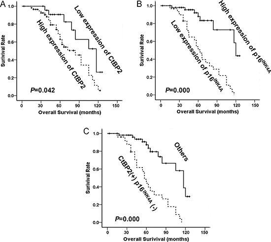 The specimens were fixed in 10% formalin and embedded in paraffin. The procedures were carried out as described as previous methods [11]. Sections were incubated overnight at 4°C with purified CtBP2, p16INK4A and Ki-67 antibodies, which were diluted all at 1:100 with 10 % normal serum in phosphate-buffered saline (PBS). Two pathologists independently scored the results of the staining, and similar results were obtained. CtBP2, p16INK4A and Ki-67 indices were determined as the percentage of all immunostained cells. The mean percentage of CtBP2-positive cells was 61.36%. The samples were considered CtBP2-positive when the percentage of positive cells was > 61.36% and negative when the percentage was ≤ 61.36%. Meanwhile the mean percentage of p16INK4A-positive cells was 37.14%, so the samples were considered p16INK4A-positive when the percentage of positive cells was > 37.14% and negative when the percentage was ≤ 37.14%.