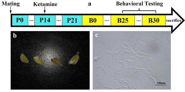 Figure 1: Mating and drug administration. The Vaginal suppository (b) and sperm (c) were observed and female rats were defined as pregnant at day 0 (P0). Female rats were anesthetized via intravenous ketamine injection on P14. The first day after birth was recorded as B0. During B25-B30, behavioral testing was utilized to test the learning and memory capacities (a).