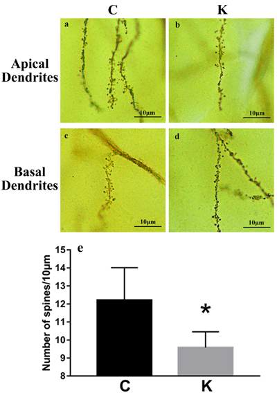 Figure 3: Golgi staining revealed hippocampal dendritic spine density. 10 μm of apical a. and b. and basal c. and d. dendrites were randomly selected from each pyramidal neuron for inspection (via 200 × oil immersion lens) to quantify spinal density. e. Spinal density decreased by 21.6% in K group compared to C group (p < 0.05).