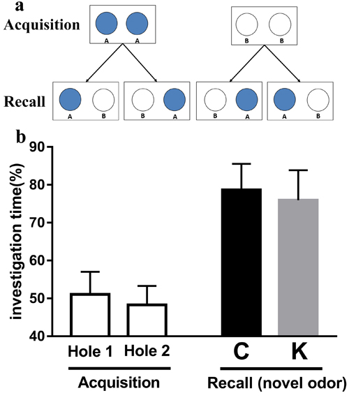 Figure 6: Olfactory discrimination tasks are excellent measures of learning and memory in rats. The acquisition test (one session) consisted of presentation of one odor (limonene or carvone), presented in both holes. The recall test consisted of a 3 min session in which one hole was odorized with the previously presented odor, while the other hole with a novel odor (a). There was no significant difference in the investigation time of novel odor between K group and C group (b).
