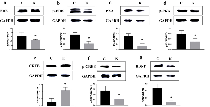 Figure 8: Ketamine exposure affects protein expression in the hippocampus. Protein levels of ERK a., p-ERK b., PKA c., p-PKA d., p-CREB f., and BDNF g. signifcantly decreased in the hippocampus (p < 0.05) to 91.6%, 71.1%, 74.5%, 92.5%, 67.4%, and 64.2%, of their initial values, while the CREB e. protein level signifcantly increased to 129%..