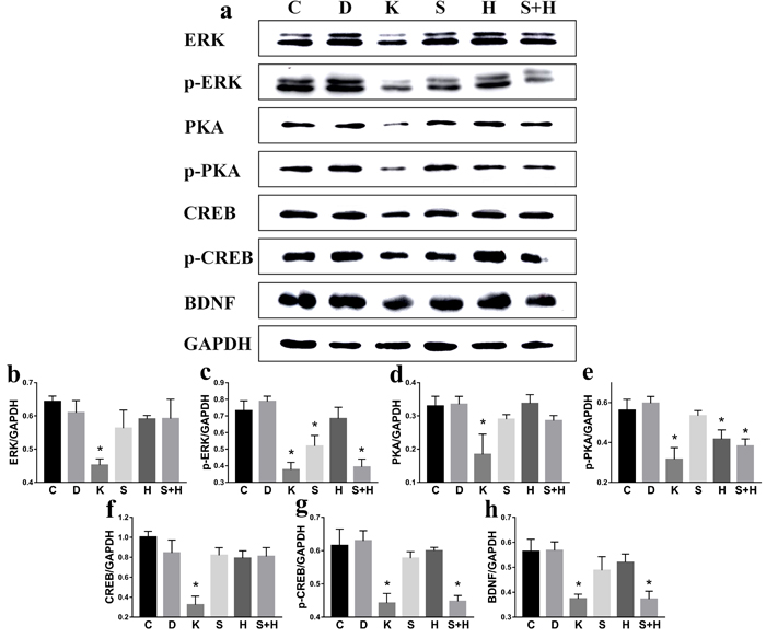 No significant difference was found between C and D group. Compared to C group, the protein levels of ERK, p-ERK, PKA, p-PKA, CREB, p-CREB, and BDNF decreased significantly (p < 0.05): p-ERK decreased to 70.9% in S group (p < 0.05), p-PKA decreased to 74.4% in H group (p < 0.05), and the protein levels of p-ERK, p-PKA, p-CREB, and BDNF decreased to 53.7%, 68.1%, 72.7%, and 66.1% (p < 0.05). The protein levels of p-ERK decreased by 24.3% in S+H group compared to S group, while the p-PKA protein levels decreased by 8.5% in S+H group compared to H group (Figure 9).