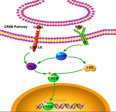 Figure 10: CREB pathway. Several signaling pathways, including those involving ERK, and PKA have been associated with the regulation of de novo protein synthesis in the context of synaptic plasticity, converging on the phosphorylation of CREB at Ser133 residue.