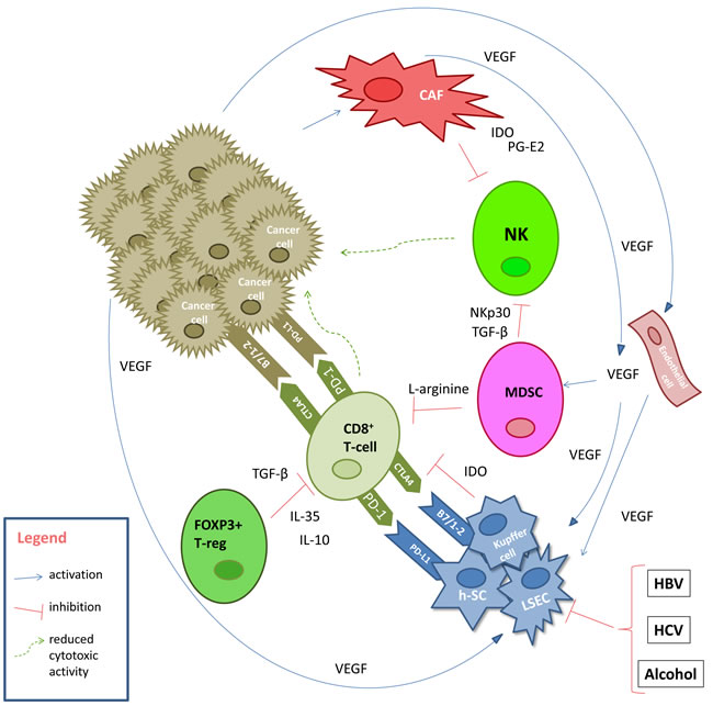 Vascular endothelial growth factor (VEGF)/VEGF receptor (VEGFR) axis, one of the most important molecular pathways controlling angiogenesis, plays a key role in tumor microenviroment including immunosupression. VEGF is known to inhibit DCs maturation through the activation of NF-KB which is able to influence the differentiation of monocytes into DCs. In addition, VEGF promotes an immunosuppressive phenotype both increasing the DCs production of IDO, a strong inhibitor of T-cell activation, as well as inactivating STAT3 [23]. Interestingly, Motz et al. reported that VEGF could induce Fas Ligand expression in tumor endothelial cells, inhibiting cytotoxic T-lymphocyte (CTL) infiltration in the tumor and reducing their cytotoxic activity [24].Voron et al., on the other hand, showed that VEGF induces exhaustion in intratumoral CD8+ T cells by promoting the expression of PD-1 and other checkpoint molecules such us CTLA-4 and TIM-3 [25]. Myeloid-derived suppressor cells (MDSCs) were shown to inhibit NK cell activation though TGF-β and NK protein 30 and to regulate T-cell proliferation by L-arginine. Intratumoral MDSCs infiltration correlates with circulating VEGF levels in several solid tumors, including HCC [26]. Furthermore, injection of recombinant VEGF increased MDSC population in vivo, and liver-specific overexpression of VEGF led to accumulation of proangiogenic MDSCs in a SDF1α/CXCR4 pathway-dependent manner [27].