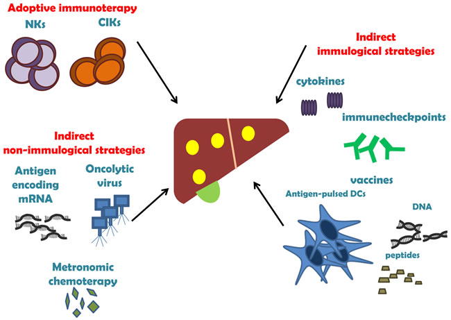 There are three main strategies to improve tumor-specific immune response (Figure 2): i) adoptive immunotherapy - HCC-epitopes immunized cells, which recognize and act against cancer cells; ii) indirect immunological strategies - cytokines, immune checkpoint blockade mAbs, cancer vaccines used to increase immune system activity; iii) indirect non immunological strategies - antigen-encoding mRNA strategy in HCC, metronomic chemotherapy, oncolytic viruses [33]. Table 2 summarises the main clinical trials and restrospective studies or meta-analysis in HCC immunotherapy.