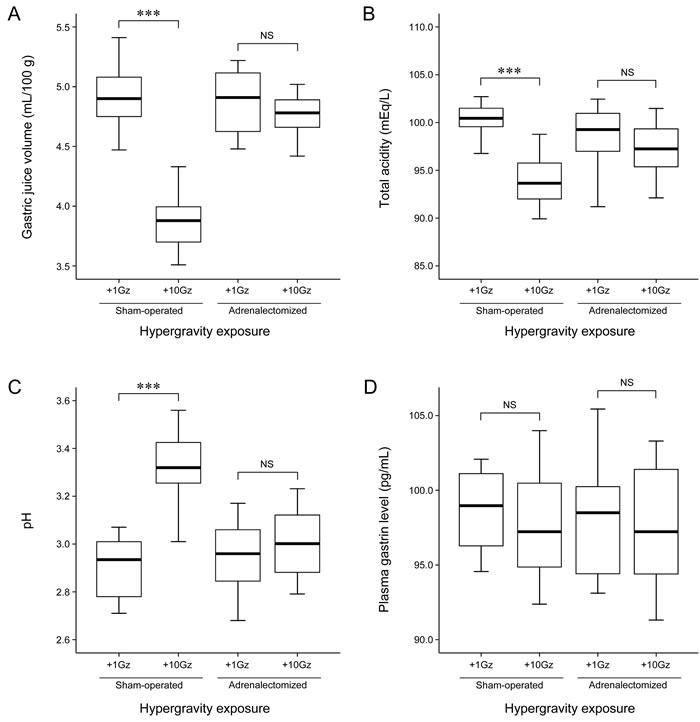 Figure 1: Effects of adrenalectomy on gastric juice parameters and plasma gastrin level in hypergravity-exposed rats. Box and whisker diagram. A band inside each box indicates the median value of each group. In the sham-operated rats, acute exposure to hypergravity significantly decreased gastric juice volume (P < 0.001) and total acidity (P < 0.001) and increased gastric juice pH (P < 0.001). In contrast, in the adrenalectomized rats, there were no significant differences in the volume (P = 0.712), total acidity (P = 0.279), and pH (P = 1.000) of gastric juice between the hypergravity-exposed and nonexposed rats. In addition, acute exposure to hypergravity in the sham-operated rats did not significantly alter plasma gastrin level (P = 0.985). Also in the adrenalectomized rats, there was no significant difference in plasma gastrin level between the hypergravity-exposed and nonexposed rats (P = 0.990). ***P < 0.001; NS, not statistically significant.