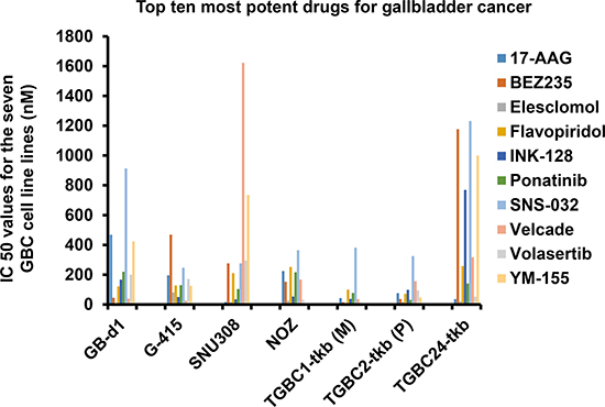 Figure 1: Top five most potent drugs for gallbladder cancer. Seven human gallbladder cancer cell lines GB-d1, G415, SNU308, NOZ, TGBC1TKB, TGBC2TKB and TGBC24TKB were used for the rapid small molecule inhibitor screen including a panel of 130 small molecule inhibitors. Cell viability testing was carried out on the small-molecule inhibitor screening plates and synergy plates using a cell proliferation assay.