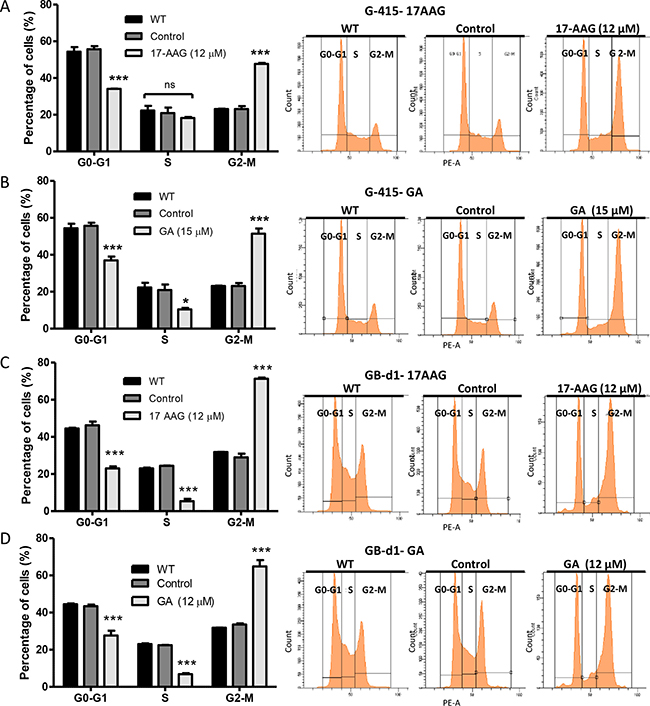 Figure 4: Effect of 17-AAG and GA on cell cycle on human GBC cells. (A and B) G-415 and (C and D) GB-d1 cells were treated with dimethylsulfoxide or 12 μM and 20 μM of 17-AAG or with 15 μM and 20 μM of GA for 24 h. Cells were processed for analysis of cell cycle distribution by flow cytometry. Data are shown as mean ± SD of three independent samples and are representative of two independent experiments. (***P < 0.001; ns: not significant).