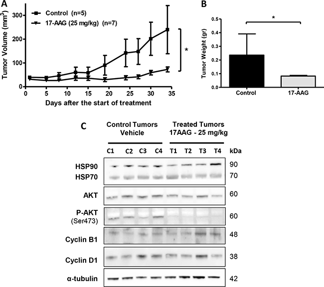 Figure 6: In vivo efficacy of 17-AAG on human GBC xenografts. (A and B) Tumor growth of mice harboring G-415 tumors. G-415 cells were injected subcutaneously into NOD-SCID mice. When tumors reached a volume of approximately 50 mm3, they were treated with 17-AAG or vehicle, as described in the materials and methods section. Animals were sacrificed at day 34 after treatment initiation. Data are expressed as mean ± SD. 17-AAG exerted a statistically significant antitumor effect compared to the groups treated with vehicle (*P < 0.05 at day 34). (C) Western blot analysis of HSP90 and HSP90 clients proteins of tumor tissue from mice treated with vehicle or 17-AAG.