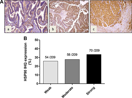 In order to establish whether HSP90 is frequently expressed in GBC, we examined the expression of HSP90 by IHC on TMAs. Examples of staining intensity are illustrated in Figure 7, showing weak, moderate and strong staining to HSP90 in the cytoplasm of GBC cells (Figure 7A). In most cases, HSP90 showed a diffuse pattern of staining. HSP90 expression was seen in 182/209 cases of GBC (87%). HSP90 was strongly expressed in 70 cases (33%), moderately in 58 cases (28%), and weakly in 54 cases (26% ) (Figure 7B). There were no significant differences in HSP90 expression between dysplasia and early and advanced carcinoma lesions.