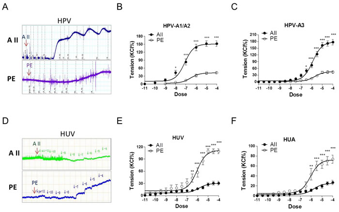 Figure 1: Angiotensin II and PE induced concentration-dependent vasoconstrictions in HPV, HUV, and HUA. A. and D., representative images of AII- and PE-mediated dose-dependent vasoconstrictions in HPV-A3 A. and HUV D.. B., C., E. and F., AII and PE induced vasoconstrictions in HPV-A1/A2 (N = 25, n = 79 for AII; N = 22, n = 71 for PE), HPV-A3 (N = 54, n = 76 for AII; N = 40, n = 62 for PE), HUV (N = 28, n = 75 for AII; N = 21, n = 67 for PE), and HUA (N = 20, n = 53 for AII; N = 23, n = 58 for PE). AII, angiotensin II; PE, phenylephrine; HPV, human placental vessels; HUV, human umbilical vein; HUA, human umbilical artery; HPV-A1/A2, first-, second-order branch of umbilical vessels in placenta (mainly the main stem villous arteries); HPV-A3, the branch of the main stem villous arteries (micro-vessels with diameter around 150 um). Error bars denote s.e.m. *P < 0.05; **P < 0.01; ***P < 0.001. N, number of participants; n, number of rings.