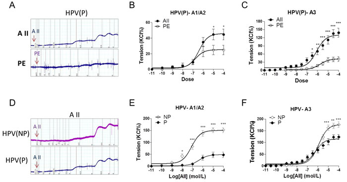 Figure 2: Angiotensin II and PE induced concentration-dependent vasoconstrictions in placenta vessels from normal and preeclamptic pregnancies. A., representative images of AII- and PE-mediated dose-dependent vasoconstrictions in HPV from preeclamptic pregnancies. B., and C., AII and PE induced vasoconstrictions in HPV-A1/A2 (N = 24, n = 46 for AII; N = 28, n = 54 for PE) and HPV-A3 (N = 23, n = 32 for AII; N = 25, n = 38 for PE) from preeclampsia. D., representative images of AII-mediated dose-dependent vasoconstrictions in HPV from normal and preeclamptic pregnancies. E., and F., AII induced concentration-dependent vasoconstrictions in HPV-A1/A2 (N = 25, n = 79 for NP; N = 24, n = 46 for P) and HPV-A3 (N = 54, n = 76 for NP; N = 23, n = 32 for P). NP, normal pregnancy; P, preeclampsia. Error bars denote s.e.m. *P < 0.05; **P < 0.01; ***P < 0.001. N, number of participants; n, number of rings.