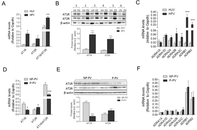Figure 3: Expressions of AII and PE receptors in placental and non-placental vessels. A., and B., mRNA and protein levels of both AT1R and AT2R in HPV (N = 21) and HUV (N = 18). C., mRNA levels of PE multifarious receptors including ADRA1A, ADRA1D, ADRA2A, ADRA2B, ADRA2C, ADRB1, and ADRB2 in HPV (N = 20) and HUV (N = 15). D., and E., mRNA and protein levels of both AT1R and AT2R in NP (N = 23) and P (N = 18) placental vessels. F., mRNA levels of PE multifarious receptors in NP and P placental vessels (N = 18/group). NP, normal pregnancy; P, preeclampsia. Error bars denote s.e.m. *P < 0.05; **P < 0.01; ***P < 0.001. N, number of participants.