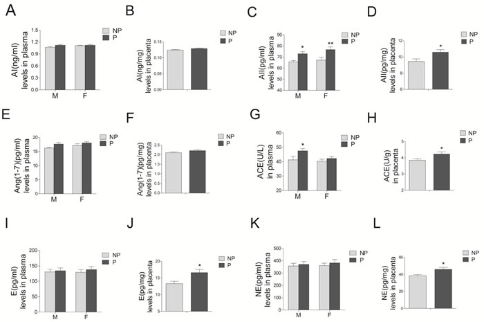 Figure 4: Levels of RAS components (including AI A. and B., AII C. and D., Ang1-7 E. and F., and ACE G. and H., as well as epinephrine E. I. and J.), and norepinephrine (NE) K. and L. in maternal blood M., umbilical cord blood F., and placenta from normal and preeclamptic pregnancies (N = 12/group). RAS, renin angiotensin system; AI, angiotensin I; AII, angiotensin II; Ang1-7, angiotensin1-7; ACE, angiotensin converting enzyme. NP, normal pregnancy; P, preeclampsia. Error bars denote s.e.m. *P < 0.05; **P < 0.01. N, number of participants.