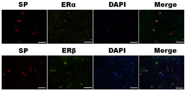 Colocalization of ERs and Substance P was explored using immunofluorescence study. As we previously described [58], the slides were immersed to a boil (99oC~100oC) in 0.01M sodium citrate buffer (pH 6.0) for 10 minutes. After the nonspecific binding was blocked with normal 5% goat serum (Vector, S-1000), slides were incubated overnight with a rabbit anti-Substance P antibody (Boster, BA0126, 1:100 dilution), followed by the Alexa Fluor® 594 Goat anti-rabbit (Invitrogen, A11037) incubation 30 min at room temperature in dark, washed with PBS 3*3 times. Then added rabbit anti-ERα antibody (Santa Cruz, sc-543, 1:100 dilution) incubating 30min at room temperature in dark, followed by Alexa Fluor® 488 Goat Anti-Rabbit IgG (Invitrogen, Cat:A11034) fluorescent conjugated secondary antibodies for 30min, washed with PBS 3*3min times. Finally, the slides were mounted with 2-(4-amidinophenyl)-6-indolecarbamidine dihydrochloride (DAPI) mounting solution (5 µg/ml) (Invitrogen, P36935). As for the rabbit anti-ERβ antibody (Abcam Inc., ab3576, 1:100 dilution), incubated overnight at 4oC. On the following day, the slides were washed with PBS and then incubated with Alexa Fluor® 488 Goat Anti-Rabbit IgG 30min at room temperature, then washed with PBS and followed by DAPI staining as the same before. All sildes were evaluated by 50i Nikon microscope in dark. The nucleus were visualized blue using a filter 330-380 nm and positive labeled expression with green by filter 465-495 nm, with red by filter 530-600 nm. Control staining was performed on adjacent serial sections and consisted in replacing the primary antibody with 0.1% BSA in PBS.