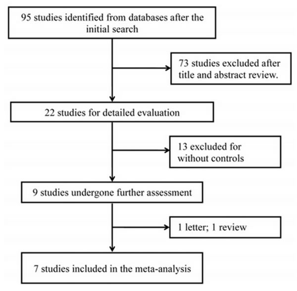 As presented in Figure 1, 95 studies were retrieved from databases after the initial search, and 73 of them were excluded after title and abstract review. Among the rest of 22 studies, 15 more were removed due to letter (n = 1), review (n = 1) and without controls (n = 13). Therefore, a total of 7 independent studies [15-21] were ultimately included in this meta-analysis, containing 758 cases and 752 controls. The principal characteristics of included studies are listed in Table 1. Genotype distribution in controls was corresponded to HWE in all but one study [18].