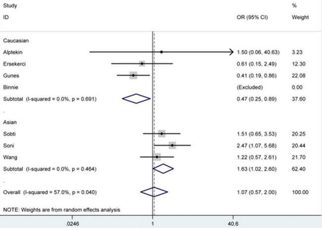 Figure 2: Forest plot of BPH susceptibility associated with PSA -158G/A polymorphism under AA vs. GG model after stratification analysis by ethnicity. The squares and horizontal lines correspond to the study-specific OR and 95% CI. The area of the squares reflects the weight (inverse of the variance). The diamond represents the summary OR and 95% CI.