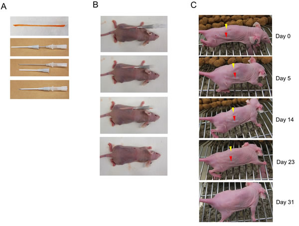 Figure 1: Gelatin sticks supplemented with doxorubicin (DXR) are inert in subcutaneous applications. A. Preparing gelatin-doxorubicin stick (GDS). A gelatin stick was made by soaking and rolling a 20x3x1 mm Gelform® sponge in doxorubicin solution and left drying overnight. A 16 gauge needle with sheath is illustrated as applicator. B. A GDS was inserted subcutaneously in an athymic nude mouse. C. GDSs made by 100 µg/ml (yellow arrowhead) or 500 µg/ml (red arrowhead) doxorubicin solution were implanted subcutaneously in a athymic nude mouse and evaluated for over a month for skin appearance. Both GDSs were absorbed after 31 days without obvious skin damage. Experiment was done in five mice.