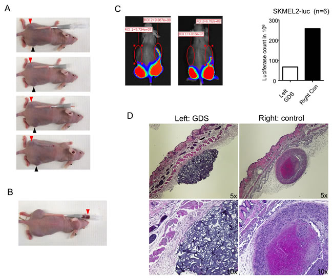 Figure 2: GDS prevented tumor seeding in biopsy of subcutaneous SKMEL2 tumor. A. A simulation of core needle biopsy was performed with a 16G needle with sheath into the subcutaneous SKMEL2 tumor on the left side of the mouse using a 16G needle with sheath and a GDS was implanted in the needle track. Similar procedure was done to tumor on the right side without GDS implantation (not shown). Red and black arrowheads: SKMEL2 tumors. B. An example of extensive bleeding (red arrowhead) during the core needle biopsy of SKMEL2 tumor. C. Ten days after the biopsy, tumor seeding was monitored by luciferase activity via Xenogen. Two mice were shown as example (right pictures). D. Transverse sections of subcutaneous GDS and seeding tumor resulted from needle biopsy. SKMEL2 human melanoma cells expressing luciferase were grown subcutaneously in athymic nude mice and biopsy was performed by inserting a 16G needle with sheath subcutaneously as shown in Figure 1B.