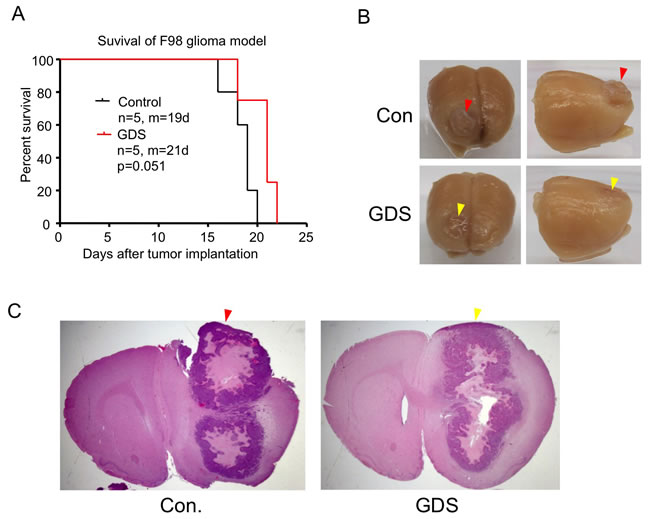 Figure 4: GDS prevented meningeal growth of brain tumor implantation. A. F98 rat glioma cells were implanted intracranially in F344 rats without (control) or with a 1-mm GDS. Survival curved of rats were compared and showed marginal but insignificant difference (P = 0.051). m: median survival in days after implantation. B. Marcoscopic appearance of rat brains implanted with F98 glioma without (-) or with (+) GDS. In the brain without GDS, Tumor outgrew around the burr hole (red arrowhead). C. Coronal sections of rat brains implanted with F98 glioma without or with GDS (H&E staining).