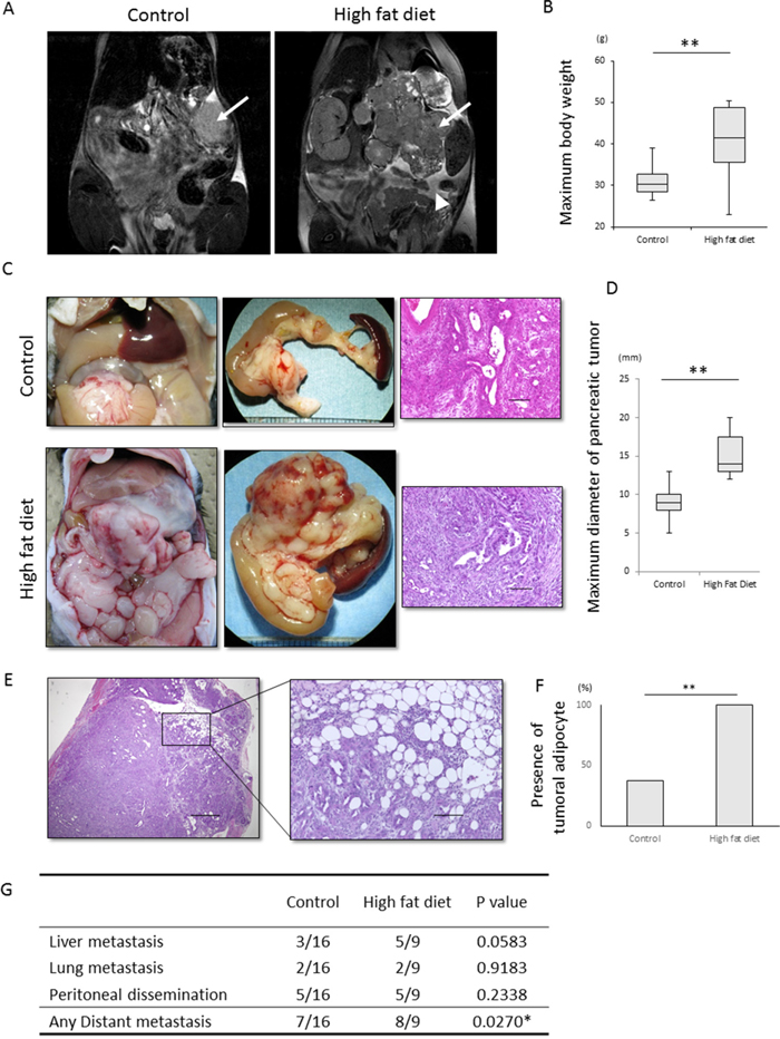 Figure 1: Effect of a high fat diet on the macroscopic appearance and histology of KPC tumors. (A, B) Effect of high fat diet on visceral fat and body weight. (A) Representative T2-weighted MRI images of KPC mice fed a normal diet and a high fat diet. Arrows indicate primary pancreatic tumors. The arrow head in the image of the mouse fed a high fat diet indicates visceral fat around the pancreas. (B) Maximum body weight was significantly higher in mice fed a high fat diet (n=9) than a normal diet (n=16). **p<0.001. (C) Representative macroscopic and histological images of KPC mice fed a normal diet and a high fat diet. Samples were stained with hematoxylin-eosin. Scale bar, 100 μm. (D) Effect of high fat diet on tumor diameter. The maximum diameter of pancreatic tumors was significantly higher in mice fed a high fat diet (n=8) than a normal diet (n=13). **p<0.001. (E, F) Effects of high fat diet on tumoral adipocytes. (E) Representative image of tumoral adipocytes stained with hematoxylin and eosin. Scale bar. 100 μm. (F) Tumoral adipocytes were significantly more frequent in mice fed a high fat (n=8) than a normal (n=13) diet. **p<0.001. (G) Effects of high fat diet on distant metastasis and organ specificity. Ingestion of a high fat diet increased the number of distant metastases, but had no effect on organ specificity. *p<0.05.