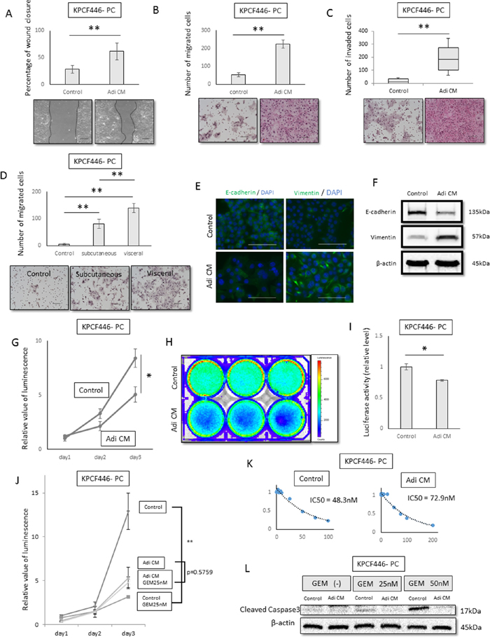 Figure 3: Effects of adipose tissue conditioned medium (Adi CM) on pancreatic cancer cell function in vitro. (A, B, C) Wound healing (A) transwell migration (B) and Matrigel invasion (C) assays show that Adi CM significantly increased the migration and invasiveness of pancreatic cancer cells (KPCF446-PC). Scale bar, 100 μm. **p<0.001. (D) Relative effects of visceral and subcutaneous fat conditioned medium on migration ability of pancreatic cancer cells (KPCF446-PC). Visceral fat conditioned medium was significantly more effective. Scale bar, 100 μm. Data are represented as mean ± standard deviation (SD). **p<0.001. (E, F) Effects of Adi CM on E-cadherin and vimentin expression of pancreatic cancer cells (KPCF446-PC), as shown by immunofluorescence (E) and immunoblotting (F) Scale bars, 100 μm. (G, H, I) Effects of Adi CM on cell viability in conventional 2D culture and luciferase activity in collagen embedded 3D culture, showing Adi CM significantly reduced viability of pancreatic cancer cells (KPCF446-PC). *p<0.05. (J, K, L) Effects of Adi CM on gemcitabine sensitivity of pancreatic cancer cells (KPCF446-PC). (J) IC50 of gemcitabine, (K) gemcitabine inhibition of cancer cell proliferation **p<0.001, and (L) expression of cleaved caspase 3.