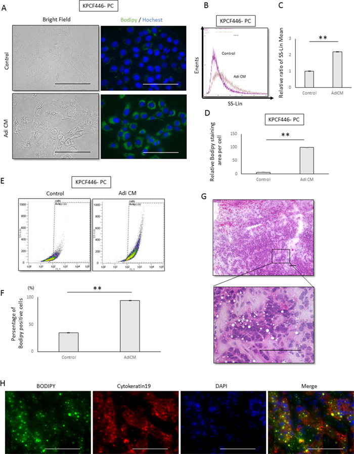 Figure 4: Effects of adipose tissue conditioned medium (Adi CM) on the morphology of pancreatic cancer cells. (A) Representative bright field and Bodipy stained images of tumor cells (KPCF446-PC). Scale bars, 100 μm. (B, C) Adi CM increased cytoplasmic granules in cancer cells, as shown by side scatter analysis of flow cytometry results. (B) Representative side scatter histograms of cancer cells (KPCF446-PC) and (C) the bar chart obtained from three experiments. Data are represented as mean ± standard deviation (SD). **p<0.001. (D) Imaging analysis showing that Adi CM significantly increased Bodipy stained areas of cancer cells (KPCF446-PC). Data are represented as mean ± standard deviation (SD). **p<0.001. (E, F) Adi CM significantly increased the number of Bodipy positive cells, as shown by flow cytometry. (E) Representative dot plot graph of Bodipy positive cells and (F) a bar chart showing averages from three experiments. Data are represented as mean ± standard deviation (SD). **p<0.001. G, H. Representative images of a frozen section of a KPC tumor stained with (G) hematoxylin-eosin and (H) Bodipy, anti-cytokeratin 19, and DAPI. Scale bars, 100 μm.