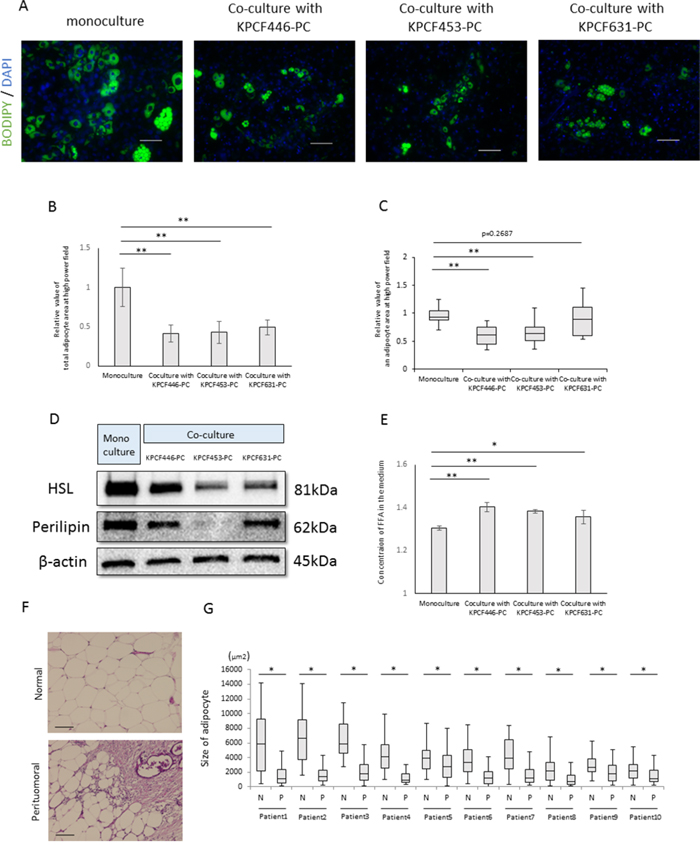 Figure 6: Effects of cancer cells on mature adipocyte size. (A) Representative images of mature adipocytes mono-cultured or indirectly co-cultured with cancer cells stained with Bodipy and Hoechst reagent. Scale bars, 100 μm. (B) Relative total areas of adipocytes in a high power field. Data are reported as mean ± standard deviation (SD). **p<0.001. (C) Relative areas of single adipocytes in a high power field. **p<0.001. (D) Immunoblotting showing that expression of hormone sensitive lipase (HSL) and perilipin in mature adipocytes was lower in mature adipocytes cultured with than without cancer cells. (E) Measurement of fatty acid concentrations in the medium using Free Fatty Acid Quantification Kits. Data are reported as mean ± standard deviation (SD). *p<0.05, **p<0.001. (F) Representative images of a human PDAC and of peritumoral and normal adipocytes. Scale bars, 100 μm. (G) Peritumoral adipocytes were significantly smaller than normal adipocytes (n=10). *p<0.05.