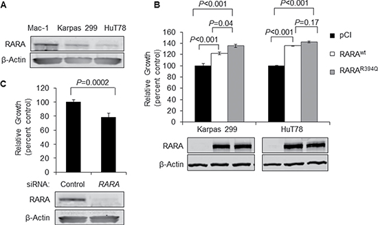 Figure 1: Overexpression of RARAwt or RARAR394Q drives T-cell lymphoma cell growth. (A) Native RARA is expressed strongly in Mac-1 and to a lesser degree in Karpas 299 and HuT78 cell lines. (B) Cell growth is increased upon overexpression of RARAwt or RARAR394Q in Karpas 299 and HuT78 cell lines with low native RARA expression. (C) Knockdown of RARA inhibits cell growth in Mac-1 cells with high native RARA expression. RARA, retinoic acid receptor alpha; wt, wild-type; siRNA, small interfering RNA.