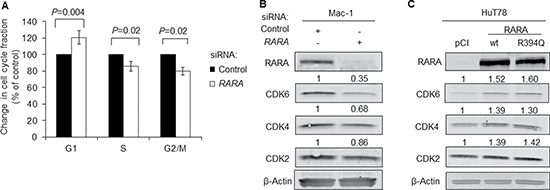 Figure 2: RARA drives expression of cyclin-dependent kinases. (A) Knockdown of RARA causes G1 cell cycle arrest (P = 0.004) in Mac-1 cells. (B) Expression of the regulators of cell cycle progression, CDK6, CDK4, and to a lesser extent, CDK2, is inhibited by RARA knockdown in Mac-1 cells. (C) Expression of CDK6, CDK4, and CDK2 is increased following overexpression of RARAwt and RARAR394Q in HuT78 cells. RARA, retinoic acid receptor alpha; wt, wild-type; siRNA, small interfering RNA; CDK, cyclin-dependent kinase.