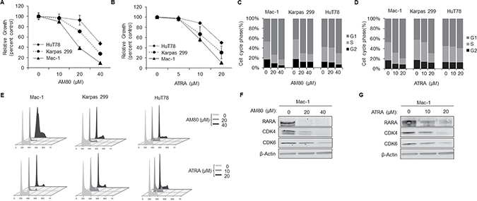 Figure 3: Retinoids cause G1-arrest and concurrent inhibition of RARA and CDK4/6 expression. (A, B) AM80 and ATRA cause dose-dependent growth inhibition in T-cell lymphoma cells that is proportional to native RARA expression (as shown in Figure 1A). (C, D) AM80 and ATRA cause G1 arrest in T-cell lymphoma cells that is proportional to native RARA expression. (E) Representative cell cycle plots of T-cell lymphoma cells after treatment with AM80 or ATRA. (F ,G) AM80 and ATRA cause RARA degradation and down-regulation of CDK4 and CDK6 in RARAhigh Mac-1 cells. RARA, retinoic acid receptor alpha; CDK, cyclin-dependent kinase; ATRA, all-trans retinoic acid.