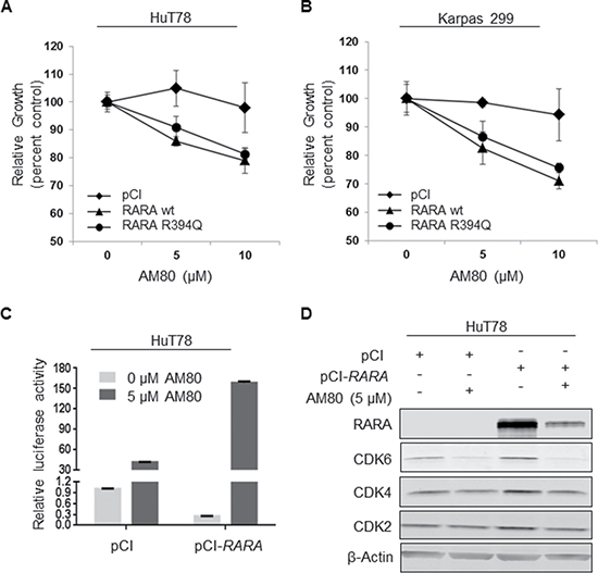 Figure 5: RARA overexpression increases chemosensitivity to AM80. (A, B) Overexpression of either RARAwt or RARAR394Q increases chemosensitivity of (A) HuT78 and (B) Karpas 299 cells to AM80. The presence of the R394Q mutation does not reduce chemosensitivity significantly. (C) RARAwt overexpression increases retinoic acid response element (RARE) activity (indicated by luciferase) in HuT78 cells treated with AM80. (D) RARAwt overexpression increases the degree of CDK2, CDK4 and CDK6 inhibition caused by AM80. wt, wild-type; CDK, cyclin-dependent kinase.