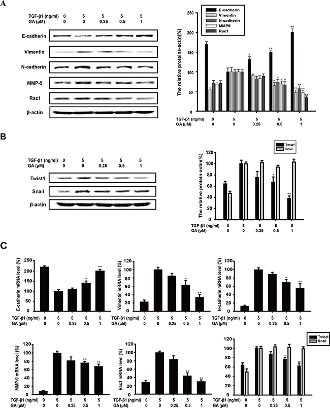 Figure 2: GA regulates the expression of EMT-related biomarkers and transcription factor TWIST1. A549 cells were treated with the indicated concentrations of GA and TGFβ1 for 24 h. (A) A549 cells were treated with the indicated concentrations of GA and TGFβ1 for 24 h. The expression of E-cadherin, vimentin, N-cadherin, MMP9, and RAC1 proteins in the cells was analyzed by western blotting using specific antibodies. An anti-β-actin antibody was used to check equivalent protein loading. (B) The expression of transcription factors TWIST1 and SNAIL was measured with western blotting. The values under each lane indicate the relative densities of the bands normalized to that of β-actin. (C) E-cadherin, vimentin, N-cadherin, MMP9, RAC1 and TWIST1 and SNAIL mRNAs were measured with real-time PCR. β-Actin was used as the internal control. The relative levels were calculated as the ratio of the relative biomarker mRNA to β-actin mRNA. Each experiment was performed at least three times. *p < 0.05 compared with the TGFβ1-treated group; **p < 0.01 compared with the TGFβ1-treated group.