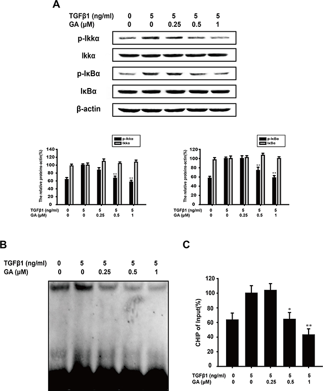 Figure 3: GA inhibits TGFβ1-induced activation of the NF-κB pathways in A549 cells. A549 cells were treated with the indicated concentrations of GA and TGFβ1 for 24 h. (A) Western blotting analyses of p-IKKα, IKKα, p-IκBα, and IκBα were performed with whole-cell lysates and specific antibodies. Anti-β-actin antibody was used to confirm equivalent protein loading. (B) Nuclear extracts wereprepared and assayed for NF-κB activation with EMSA, using 8 μg of nuclear extract. (C) Immunoprecipitated DNA was extracted and dissolved and then DNA was measured by RT-PCR. The relative levels were calculated as the ratio of TWIST to β-actin mRNA expression, compared with the Input. Each experiment was performed at least three times. *p < 0.05 compared with the TGFβ1-treated group; **p < 0.01 compared with the TGFβ1-treated group.